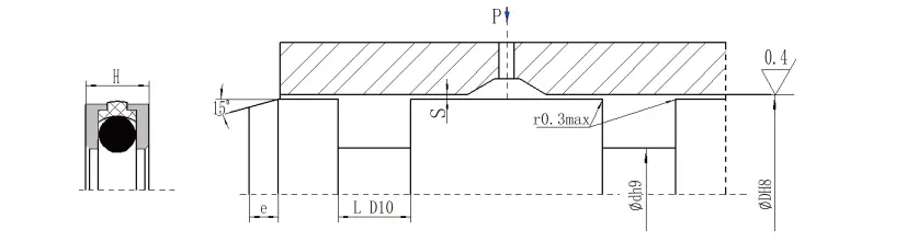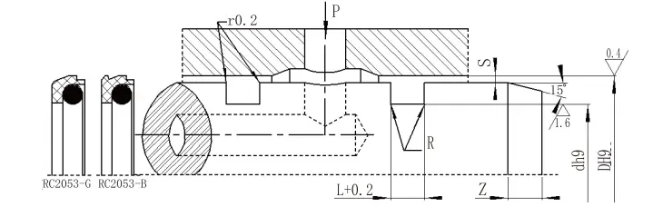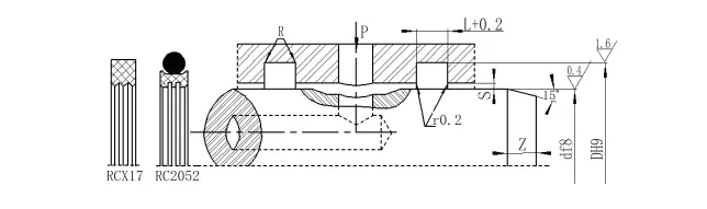 RC2054| Řada clony D H9 | Průměr drážky d H9 | Šířka drážky L+0,2 | Radiální vůleMax | Zaoblené rohy RMax | Zkosení Zmin | |