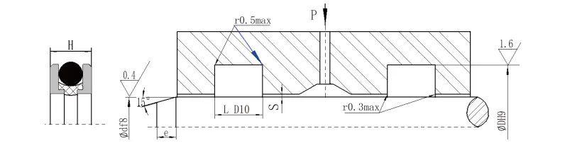 | Řada clony D H9 | Průměr drážky d H9 | Šířka drážky L+0,2 | Výška těsnění L1 | Zaoblené rohy RMax | Radiální vůle | Zkosení ZMIN | Průměr drátu O-kroužek D0 | ||