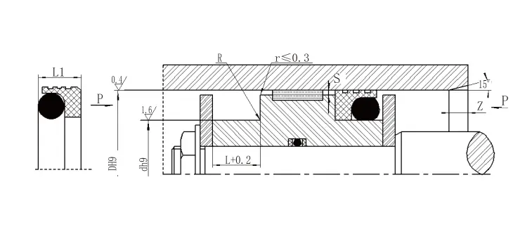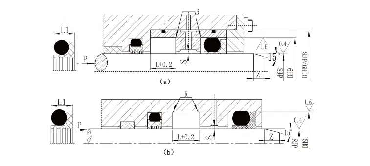 | 2. Pro rotační těsnění se doporučuje povrchová tvrdost otočného hřídele, aby byla HRC ≥ 58. 3. Pro tlak větší než 30 mPa se pro mezeru pro vytlačování doporučuje H8/F8. | ||||||||||