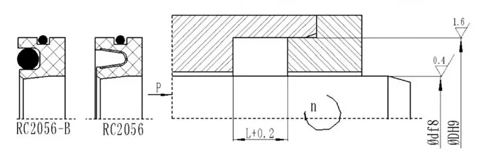 RC2056-40*62*8-PTFE4+V D*D*L, těsnicí kroužek je PTFE4 a pružina z nerezové oceli je pružina ve tvaru písmene V RC2056-B-40*62*8-PTFE4+R02 D*D*l, těsnicí materiál je PTFE4 a odpovídající O-kroužek je fluororubber